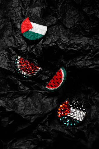 Pack of 4 hand-embroidered watermelon and Palestinian Flag brooches. Available in the vibrantly embroidered style and the crystal-adorned style. Wear your support on your sleeve and spread awareness for the cause with individually packaged brooches - one for you and three for gifting!
