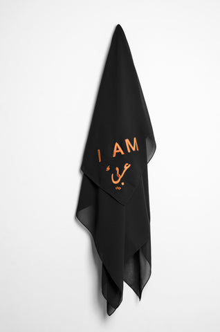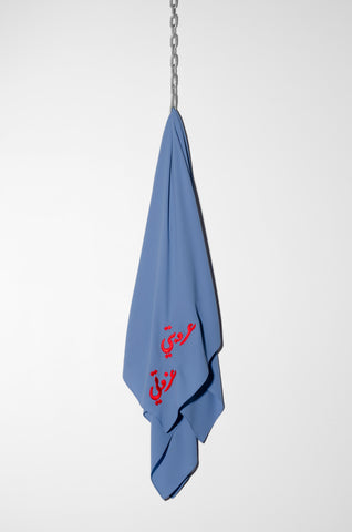 Woven from teal blue threads and featuring a hand-embroidered I AM شرقي / SHARQI, this scarf is an extremely versatile piece with finished edges. Try it wrapped and tied or draped over your shoulders as a shawl.