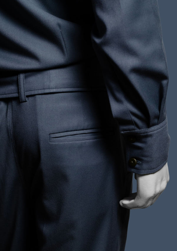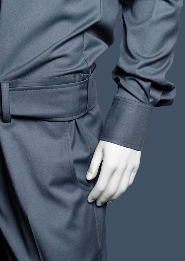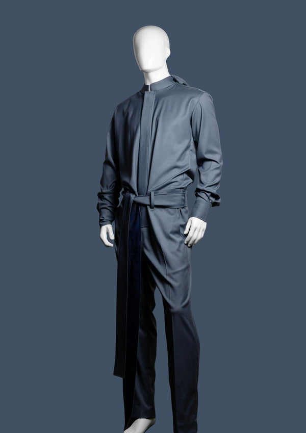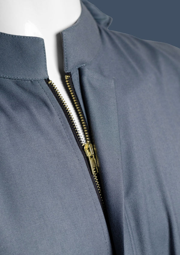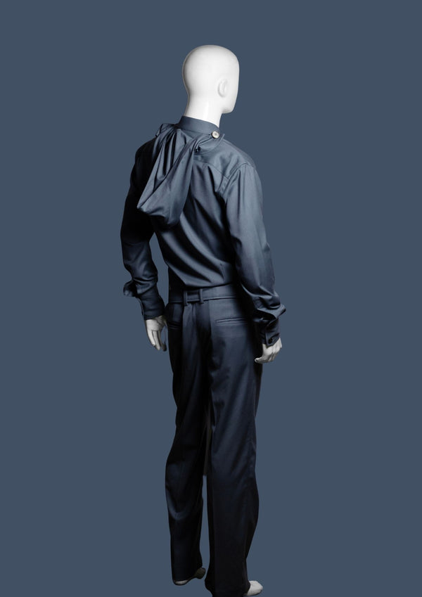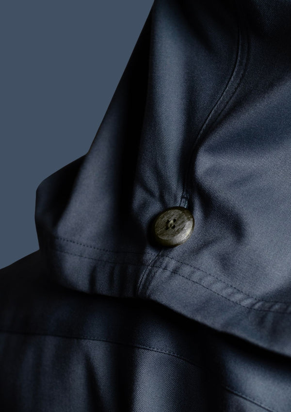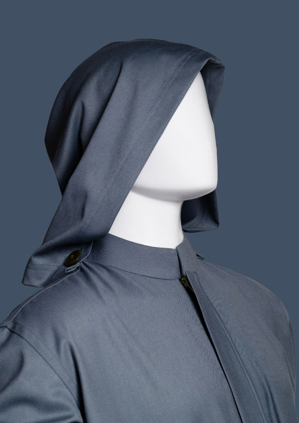 Barq is a modern hooded silhouette rendered in a cool steel-blue tone. It features a structured mandarin collar and concealed front closure for a clean, uninterrupted front. The integrated hood...