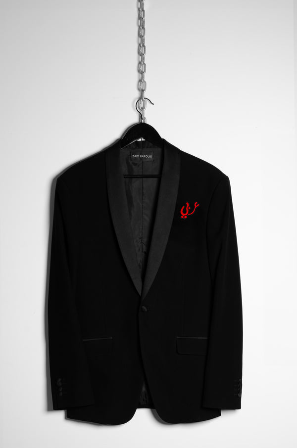 Embroidered brooch in bold red with black edging, stitched in the word “عربي” (“Arabi”). More than a word, it is an affirmation of identity and belonging, a declaration worn close...