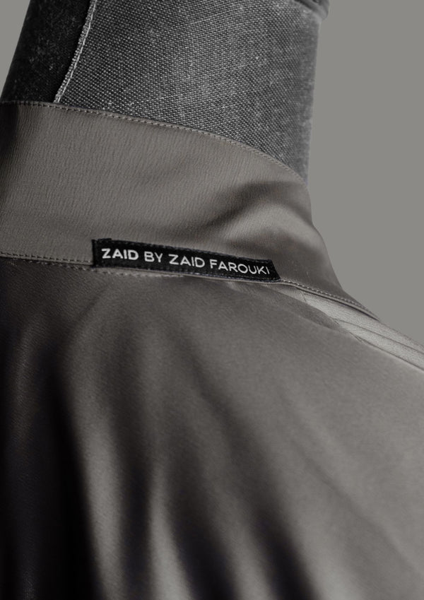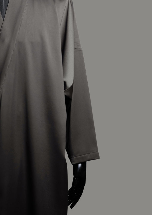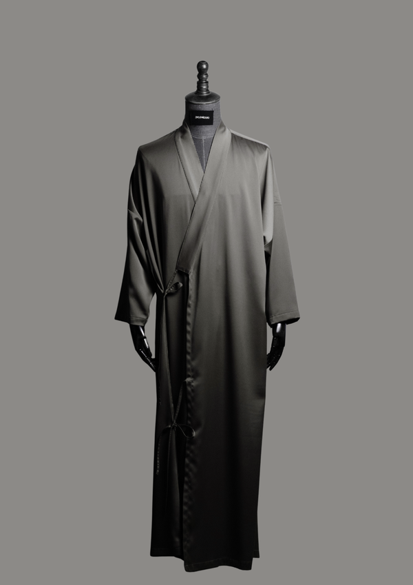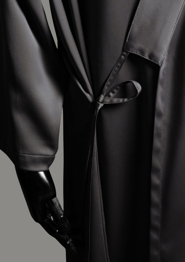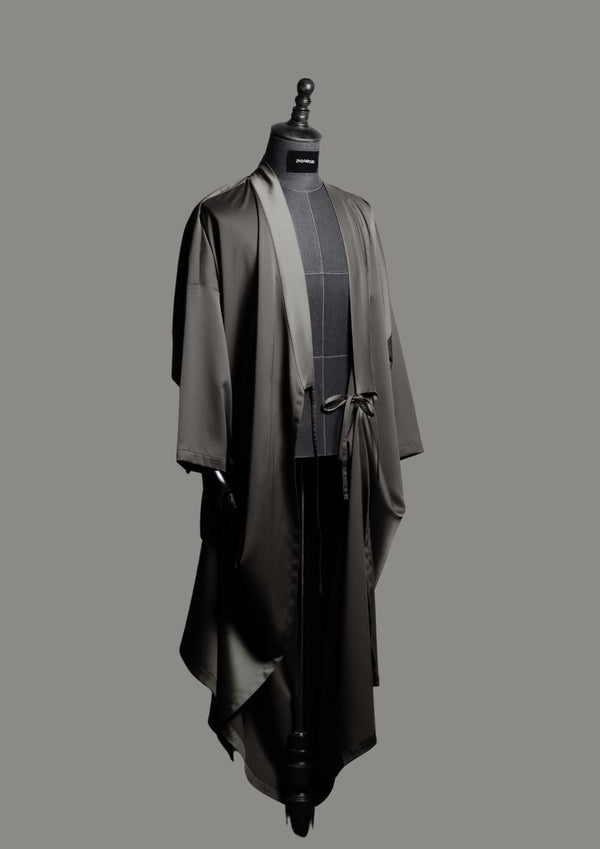 Ramād is defined by fluid structure and quiet sheen. Rendered in a cool grey satin, the silhouette falls clean and elongated, with an open front that allows natural movement and...