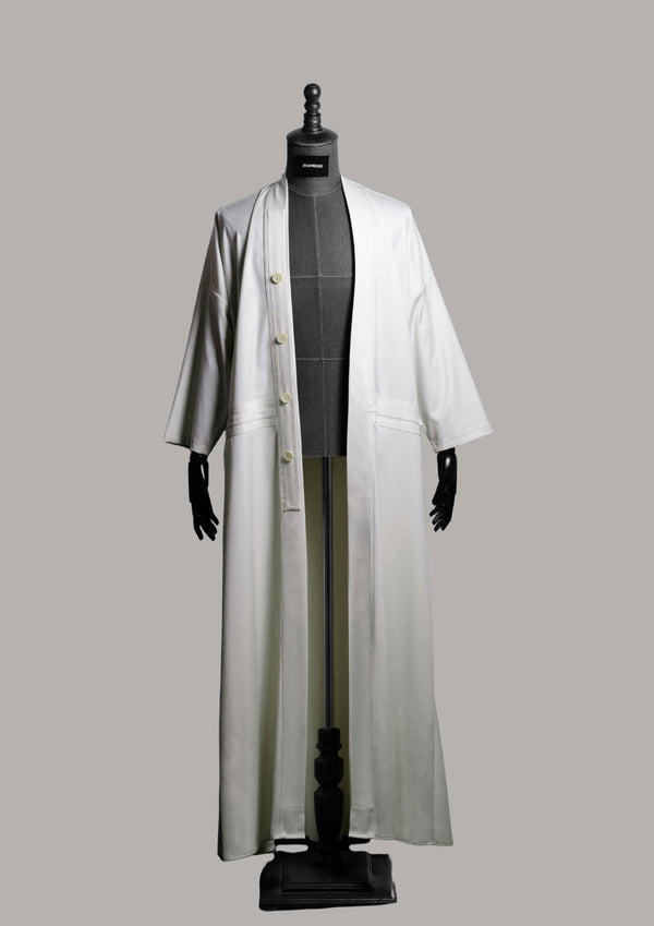 A full-length open robe in a soft sand tone, defined by its clean front placket, tonal buttons, and structured waist detailing. The relaxed sleeves and fluid drape create quiet movement,...